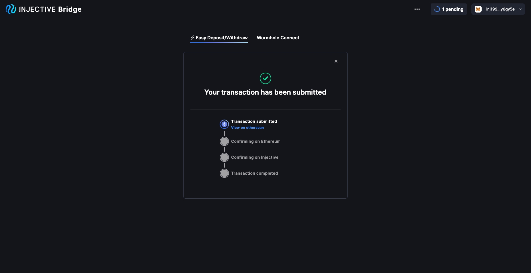 一旦批准支出和存款交易在以太坊区块链上得到确认,您将看到桥接交易的进度。一旦交易在Injective上确认,您的桥接ERC-20代币将会出现在您的Injective钱包中。(注意,如果您在源链使用了MetaMask,默认情况下,您的桥接代币将会发送到与您的MetaMask关联的INJ地址。您可以通过点击第4步开始时收款地址旁边的锁定图标来更改此设置。)