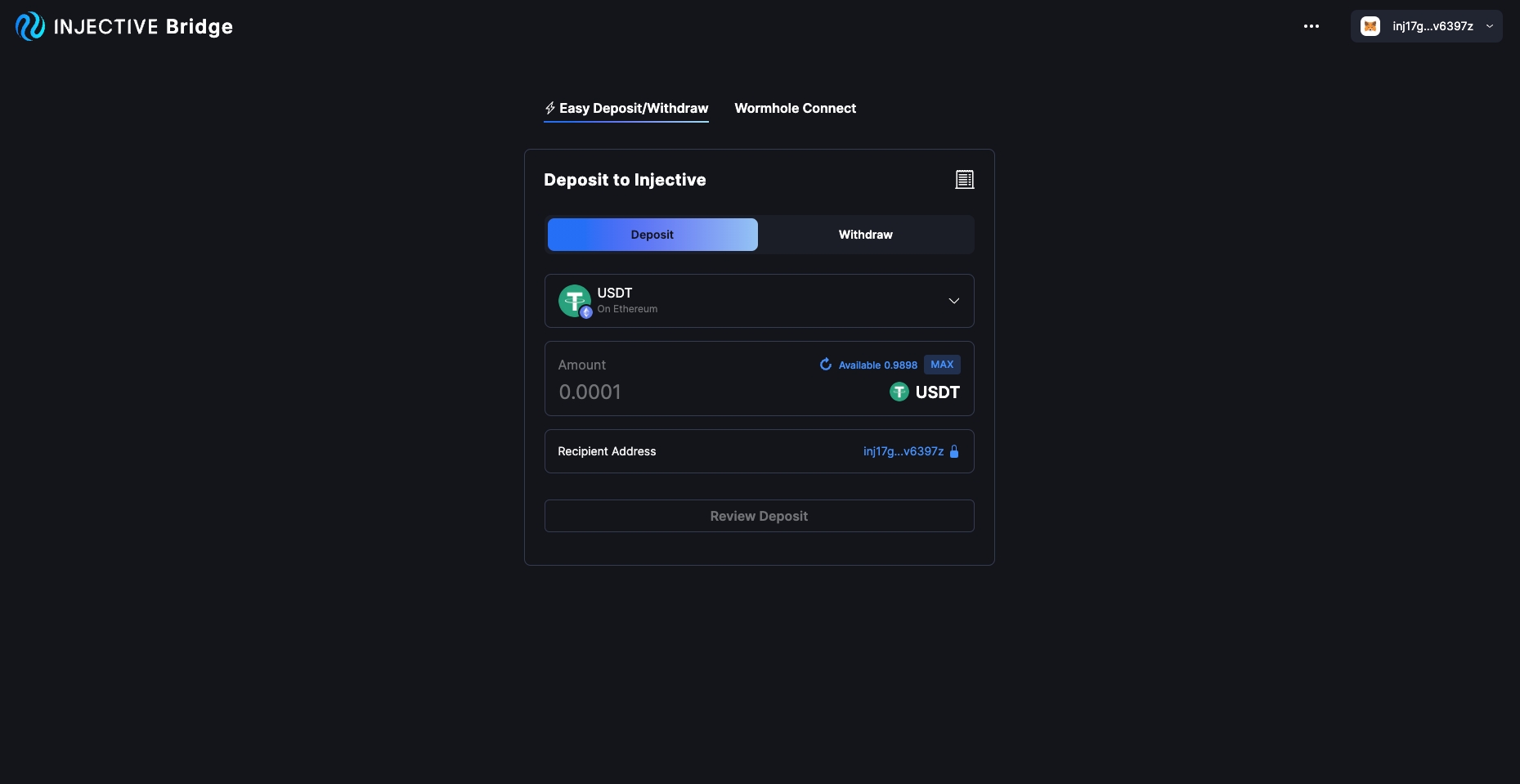 导航到 Injective Bridge 页面,开始使用 Peggy 桥接将您选择的 ERC-20 代币从以太坊桥接到 Injective。