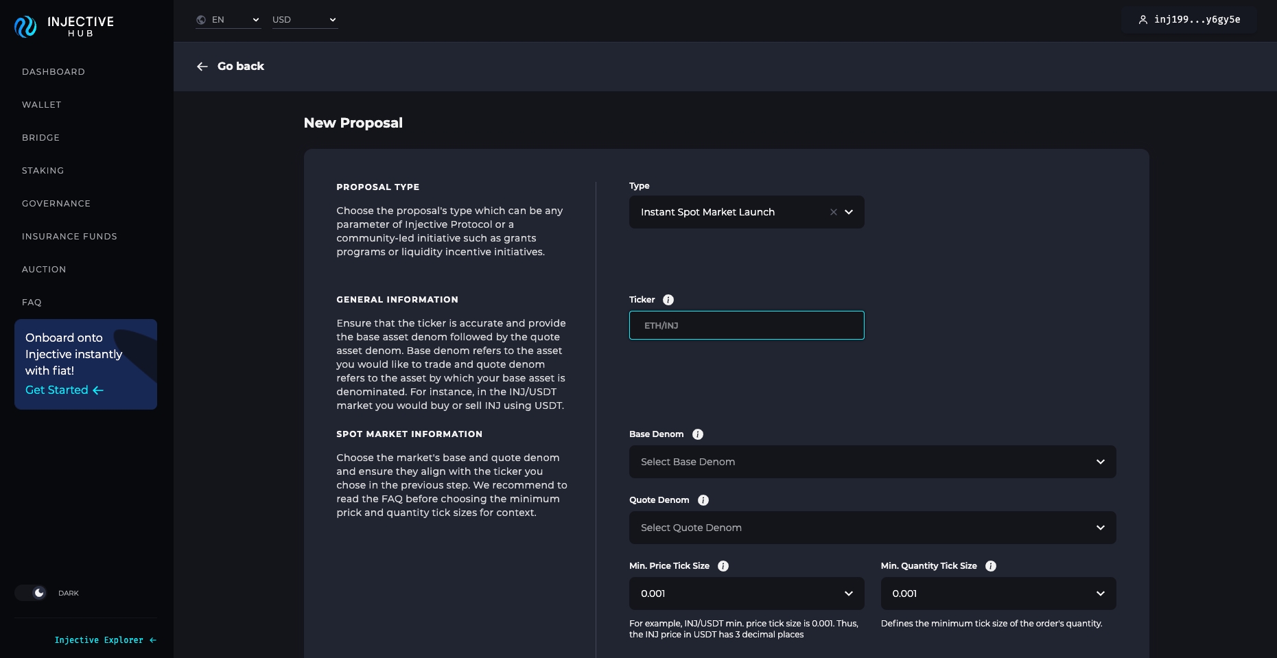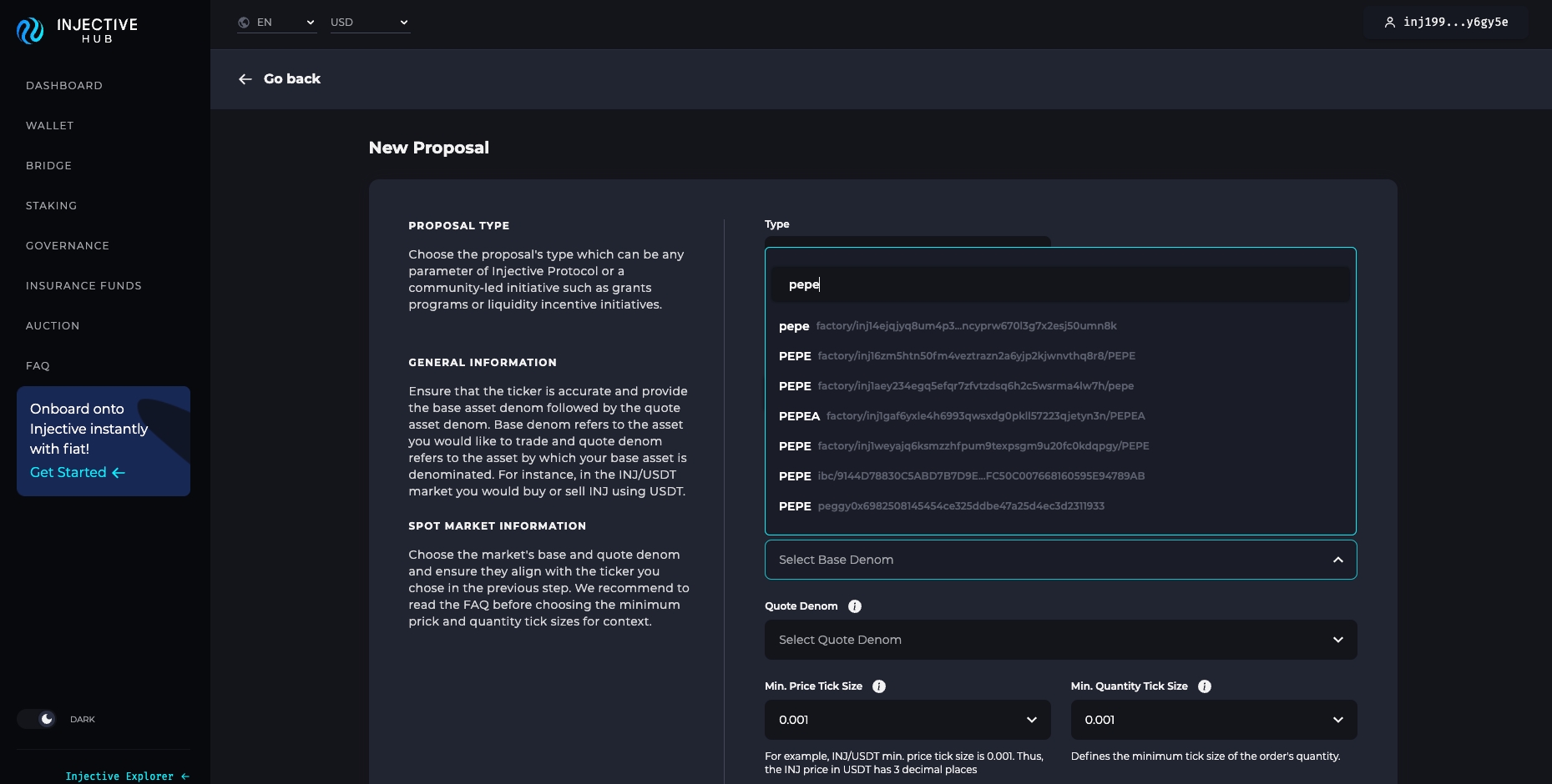 从第一个下拉菜单中选择“instant spot market launch”,并指定一个交易对。在本例中,我们使用 PEPE/INJ。然后从下拉菜单中选择基础代币。然而,请注意,可能会有多个代币使用相同的交易对名称。请始终确保匹配正确的代币地址。在本例中,由于代币是通过Peggy桥接完成的,地址将是以 peggy 开头,后面跟随ERC-20合约地址。