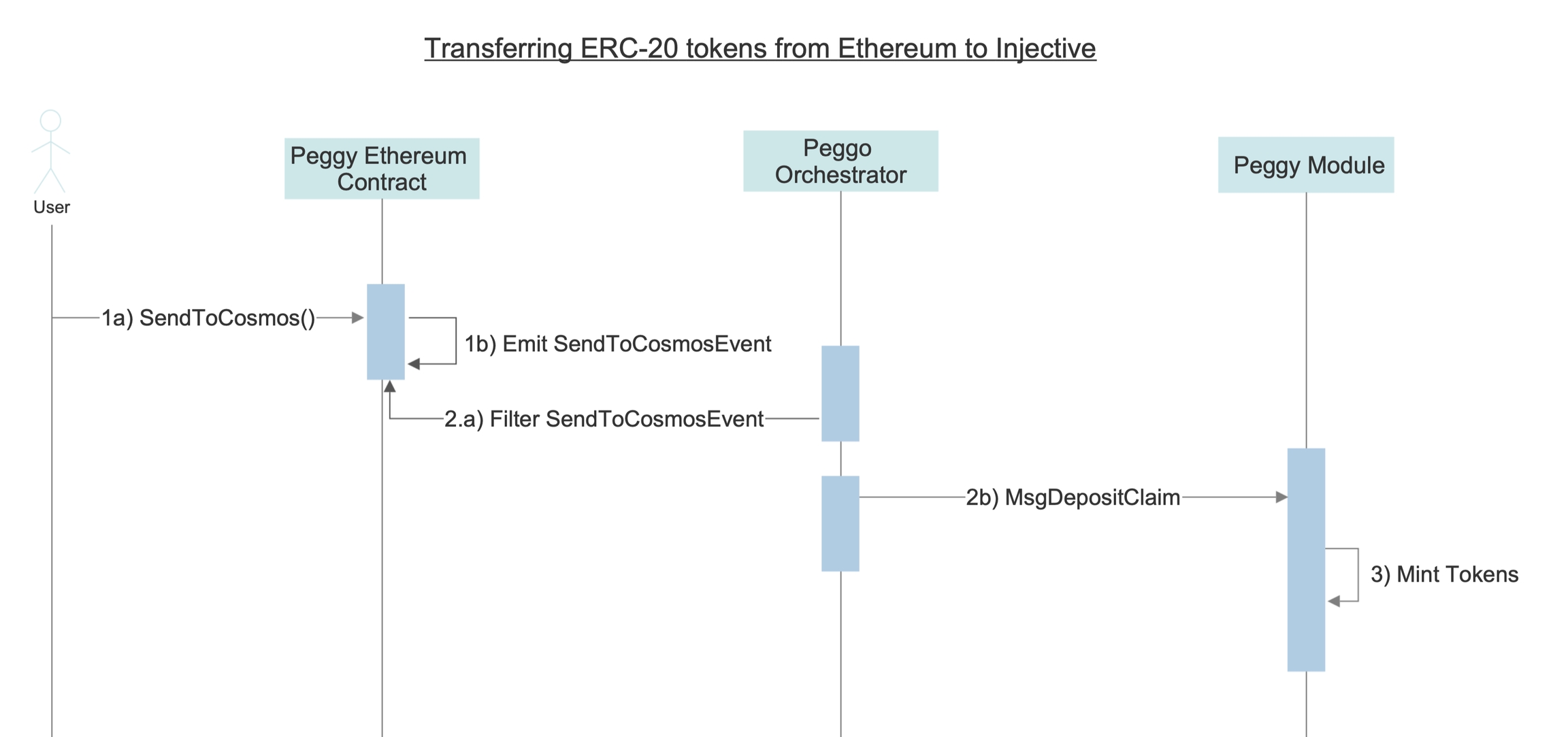 ,该消息包含存款信息,发送到Peggy模块。在Injective上铸造代币:一旦大多数验证者确认存款声明,存款将被处理。