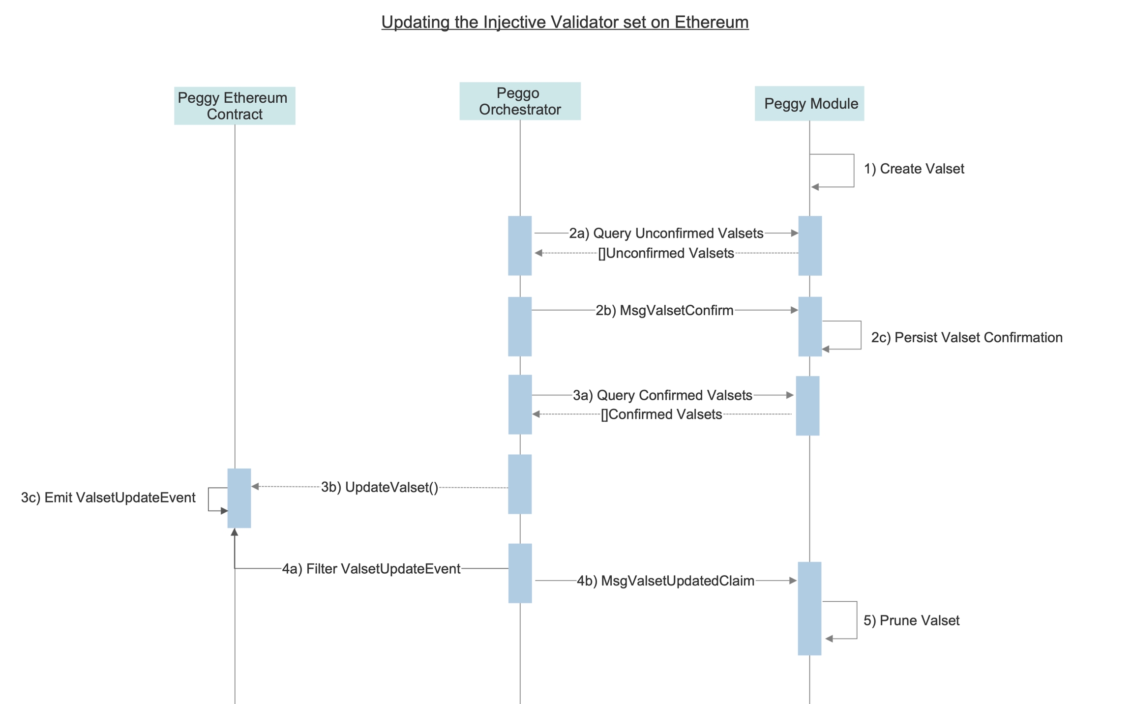 验证器集 是一系列以太坊地址,附带规范化的权重,用于表示 Peggy 合约中以太坊上的 Injective 验证器集(Valset)。通过以下机制,Peggy 合约与 Injective 链的验证器集保持同步: